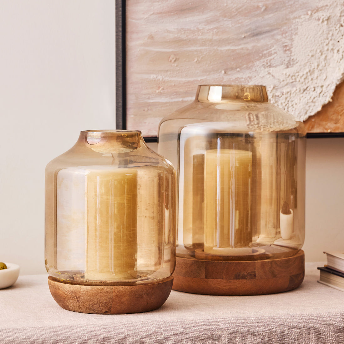 Halo Hurricanes – Set of Two Glass & Wood Candle Holders