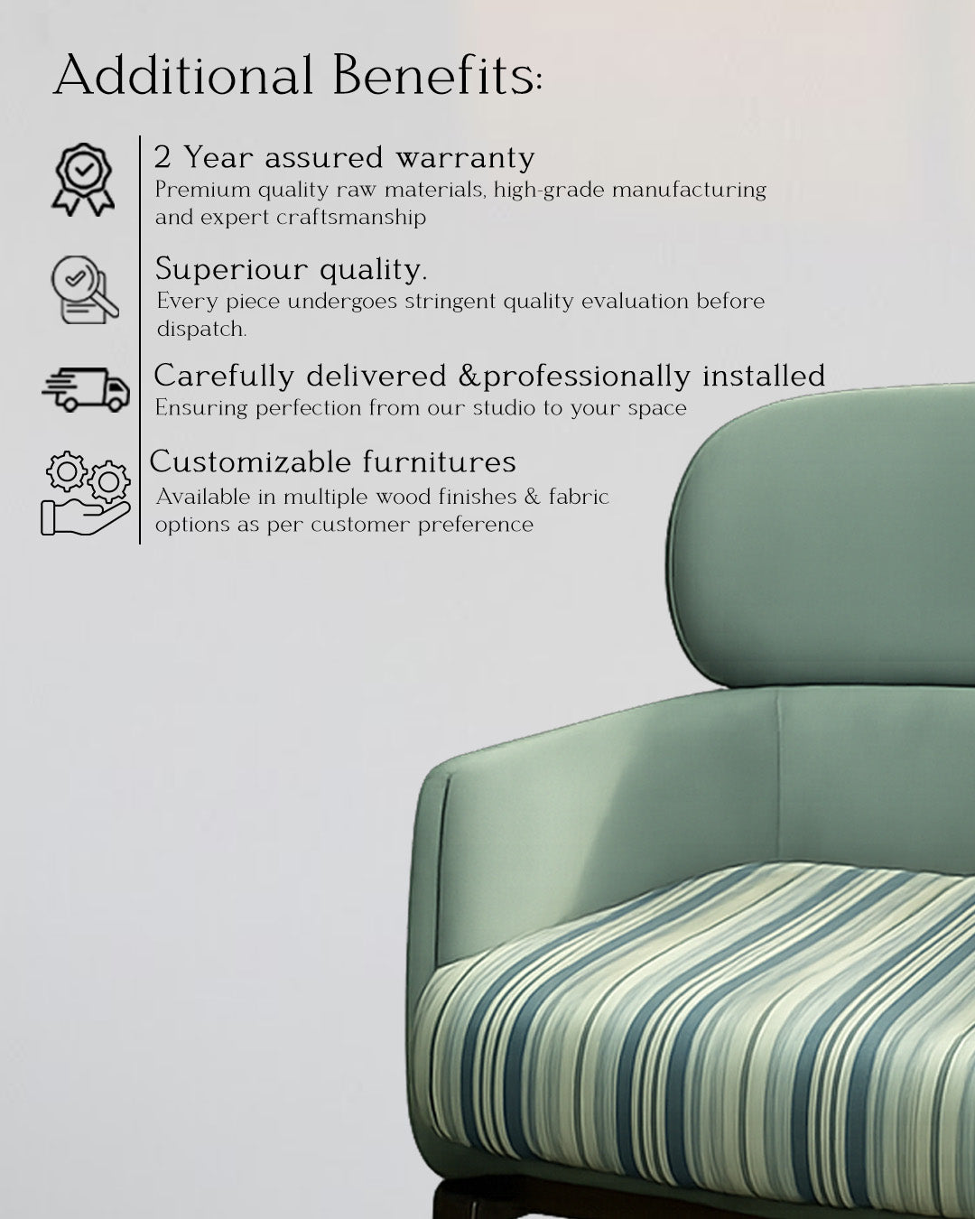 The Aeris Lounge Chair blends soft modern contours with a relaxed, inviting feel. Its gently curved backrest and cushioned arms create a comfortable cocoon-like shape, while the striped seat adds a fresh, contemporary character. Set on a warm wooden frame, the chair balances comfort and style effortlessly, making it a refined addition to living rooms, reading nooks, or any space that calls for a touch of easy elegance.