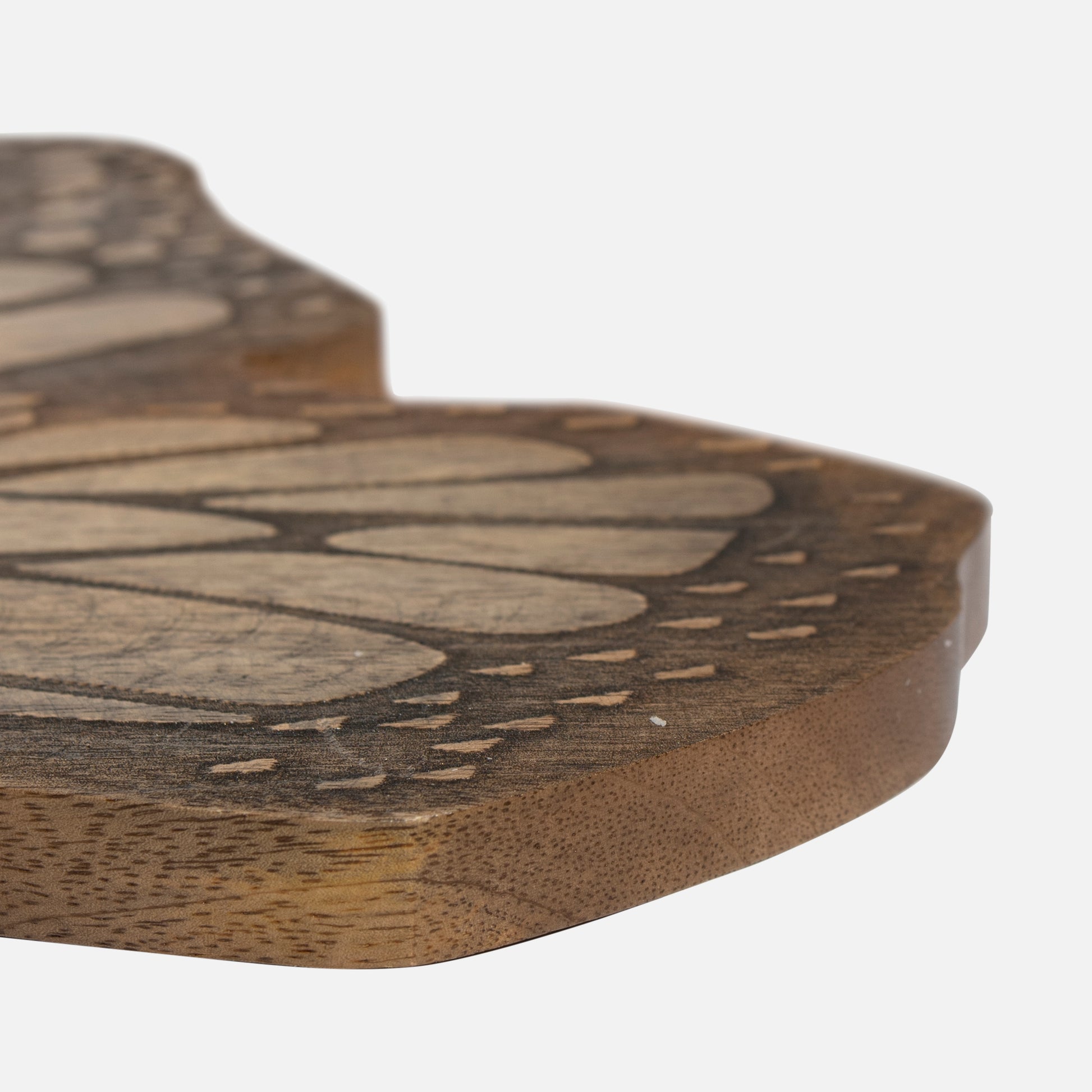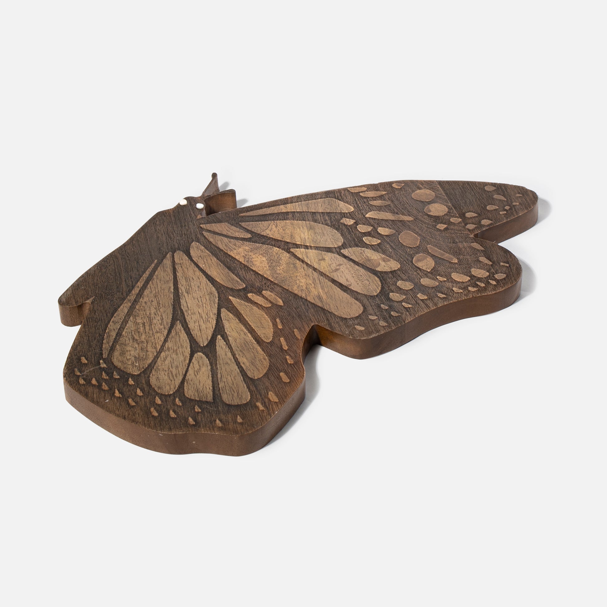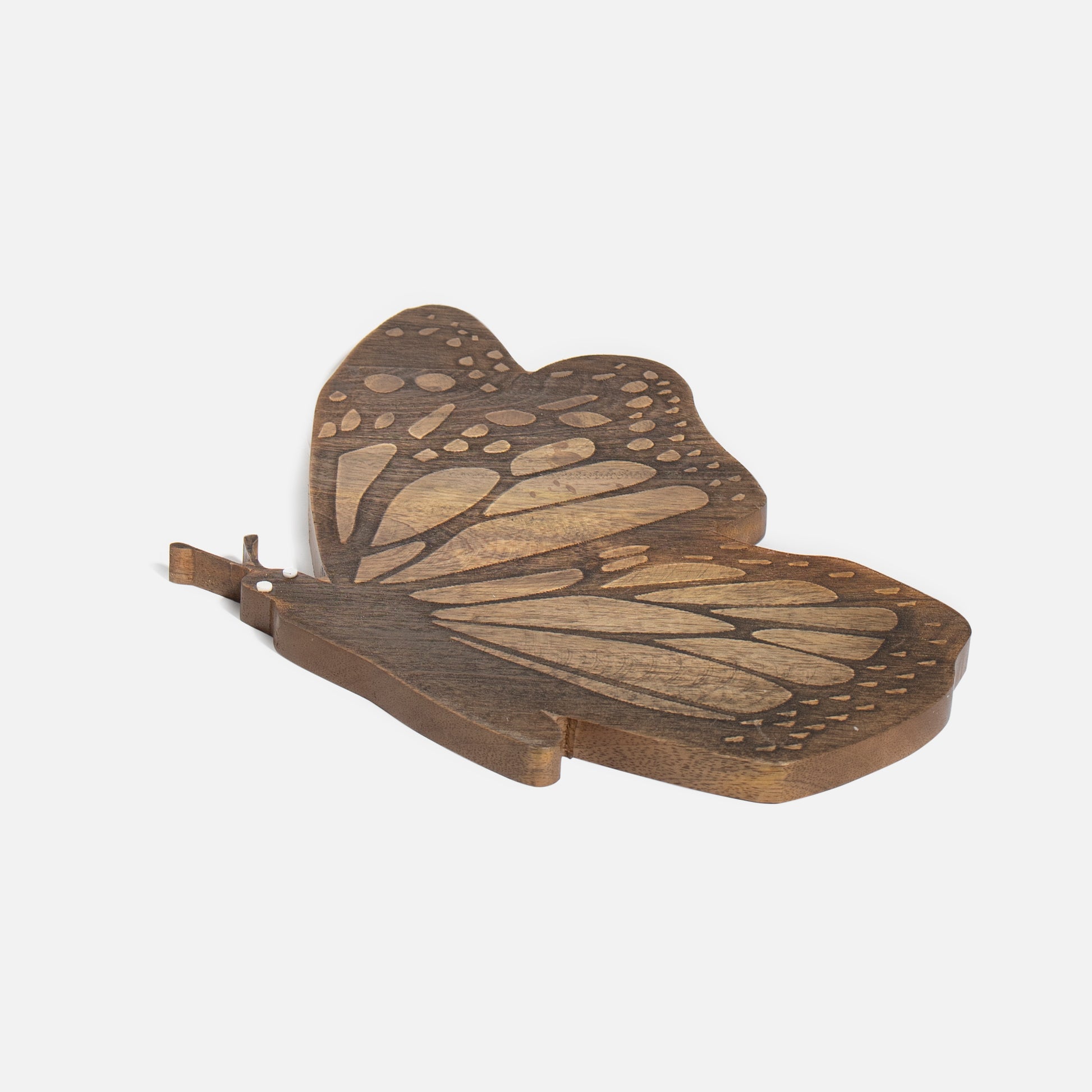 Transform your serving experience with our Butterfly Wooden Platter, a captivating blend of artistry and functionality. Expertly crafted from high-quality wood, this platter is designed in the elegant shape of a butterfly, adding a whimsical touch to your table. The 3D effect is enhanced with mesmerizing Mother of Pearl (MOP) eyes, which shimmer with iridescent hues, bringing a dynamic and eye-catching element to the design.