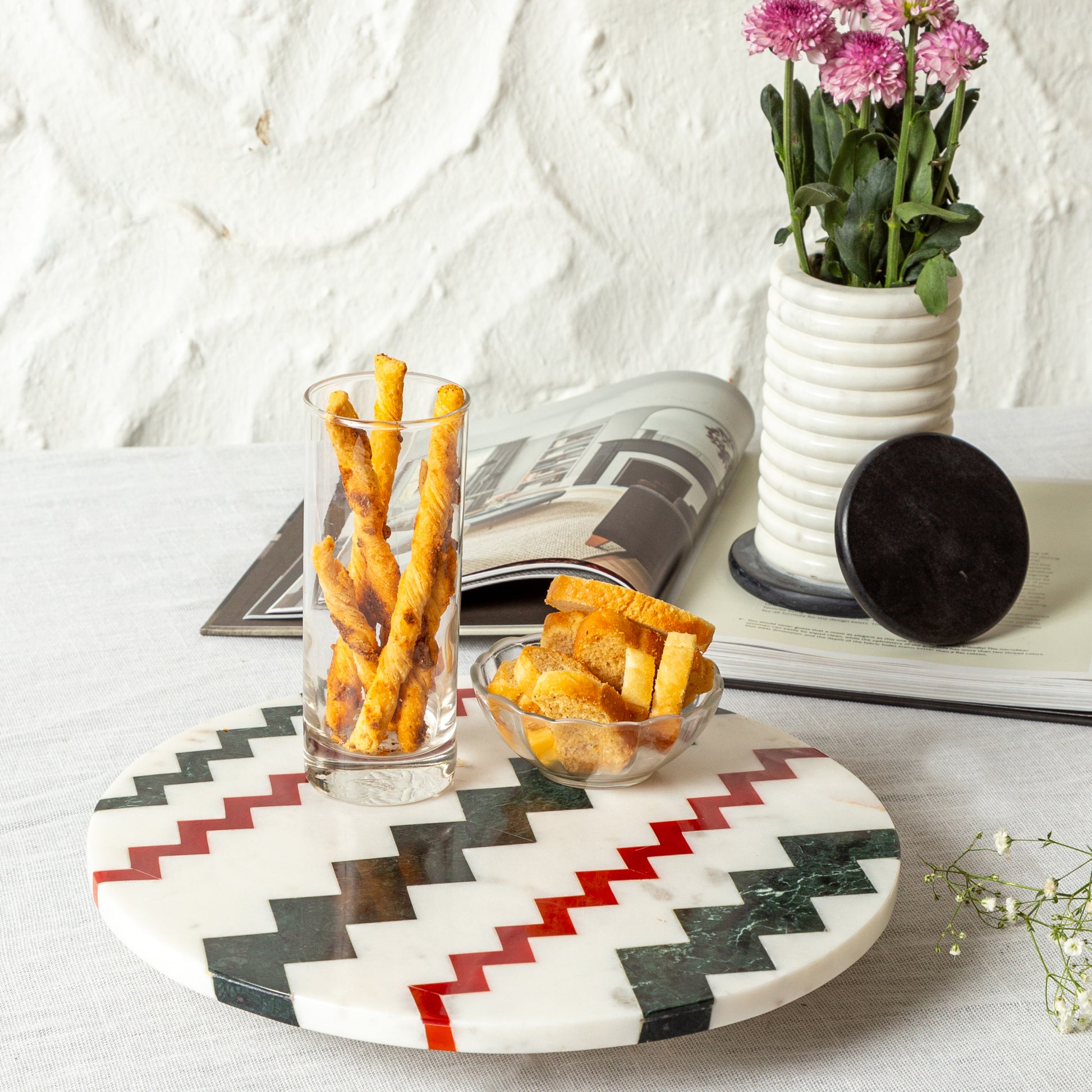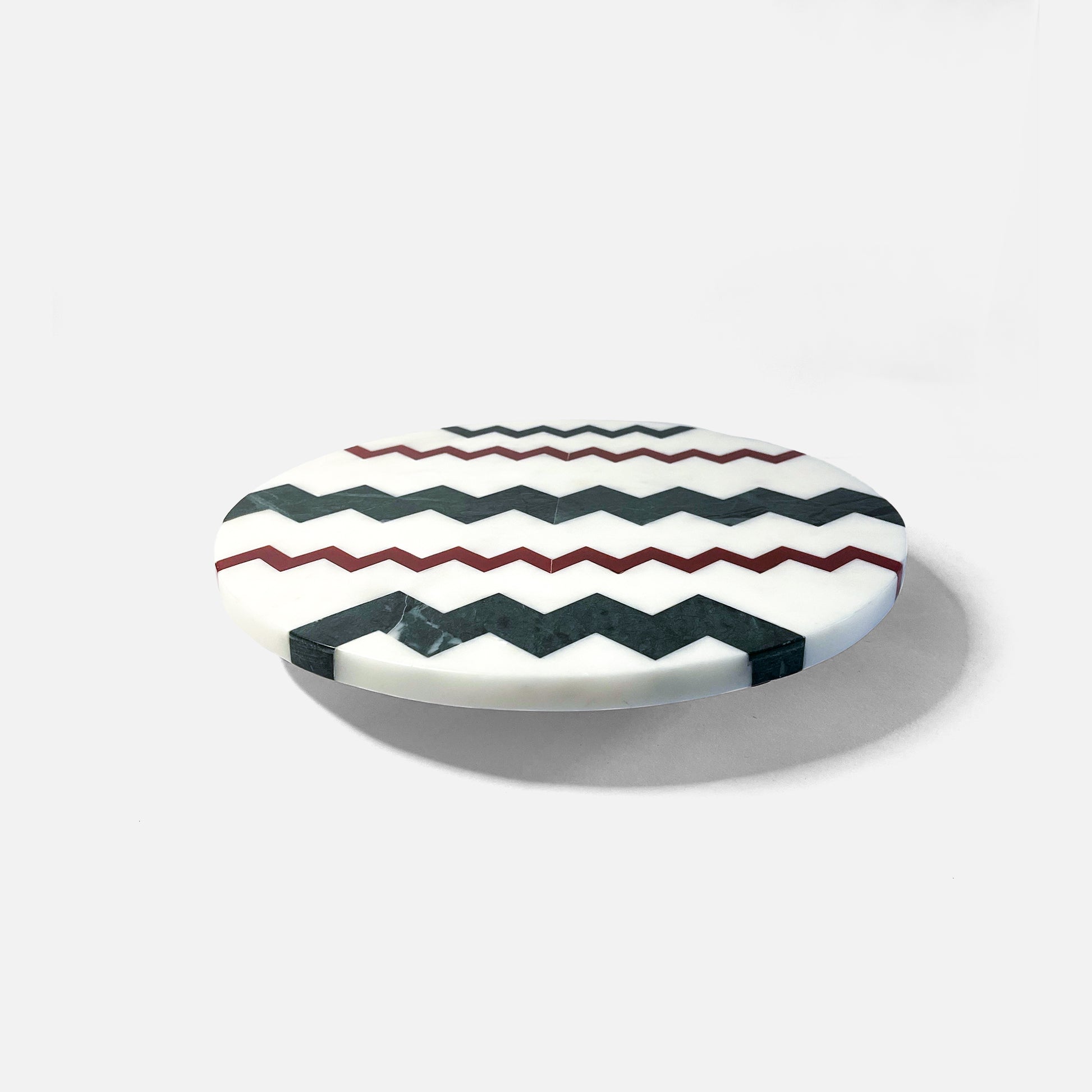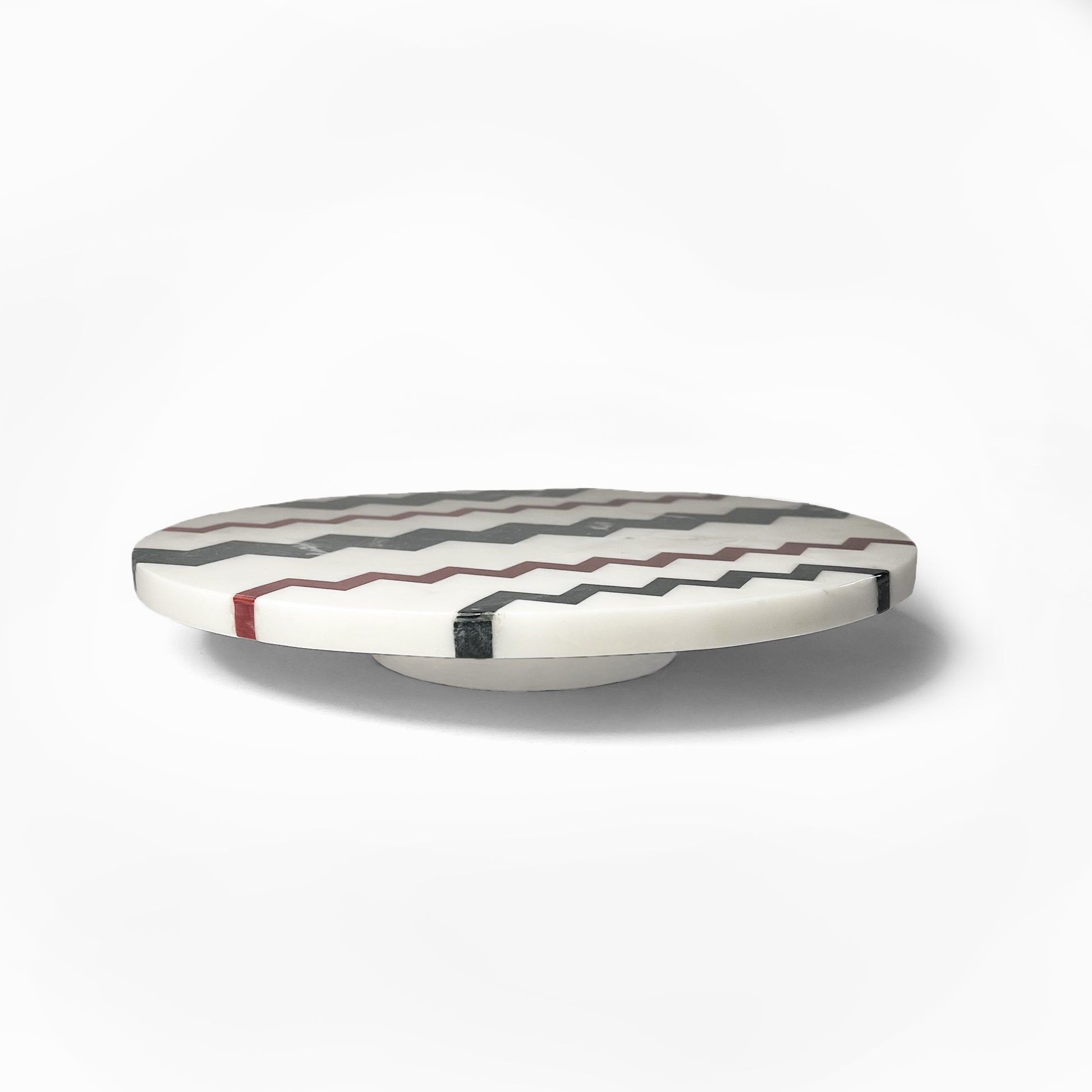 Elevate your dining experience with the Chevron Luxe Lazy Susan, a sophisticated fusion of artistry and practicality. Handcrafted from premium marble, this rotating centerpiece features an intricate chevron pattern inlay, adding a touch of modern elegance to any table. Designed for effortless entertaining, it smoothly rotates to ensure easy access to shared dishes, making it perfect for gatherings. Whether used for serving, displaying decor, or as a functional statement piece, this marble Lazy Susan is a timeless addition to refined spaces.