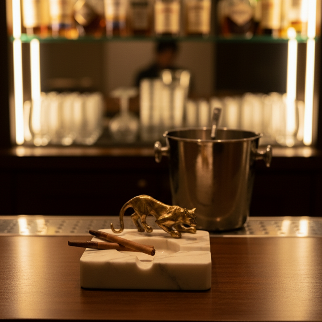 Inspired by the untamed spirit of the panther, the Feral Luxe Ashtray is Handmade by artists in Tajgarh District of Uttar Pradesh. An ultimate luxury, this piece embodies strength and sophistication in one sculptural form. Hand-carved from pristine imported marble, its solid base symbolizes permanence, while the sleek golden panther poised atop captures movement, grace, and raw power. More than an ashtray, it is a statement of luxury — blending functional design with artistic allure.