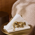Where wilderness meets refinement, the Feral Luxe Napkin holder embodies strength wrapped in elegance. A prowling leopard handmade in brass weaves through sculpted leaves, set upon a marble base that brings durability, hygiene, and timeless beauty. More than a table accessory, it is a symbol of balance—power softened by poise.