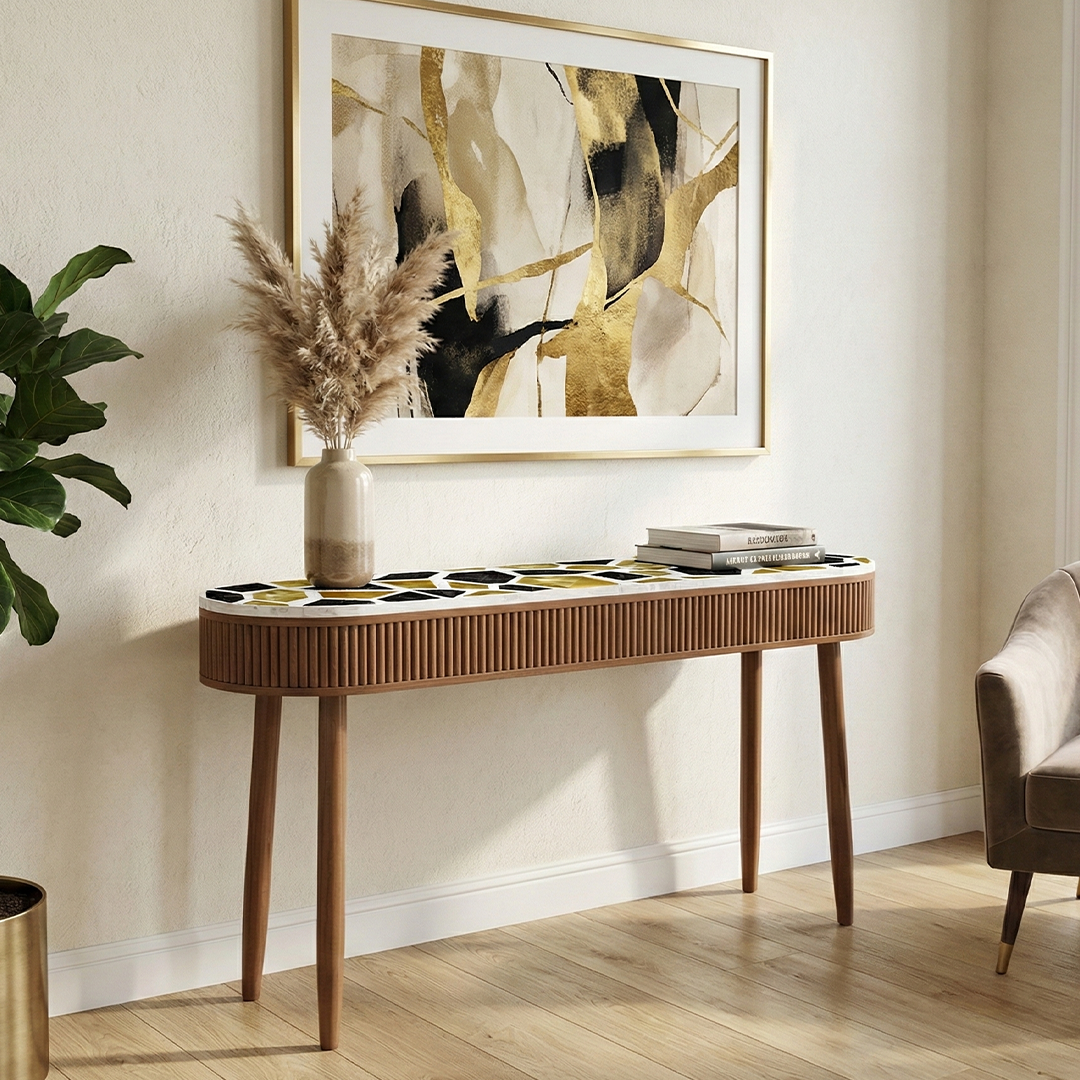 Crafted from solid teakwood, the Fumi Console Table is a refined blend of structure and artistry. Its sleek, elongated form is topped with a striking marble inlay, where geometric fragments come together in a bold yet balanced composition. The warm teakwood base adds natural depth, while the inlay surface brings a touch of modern luxury—making Fumi a statement console for entryways, living spaces, or corridors.