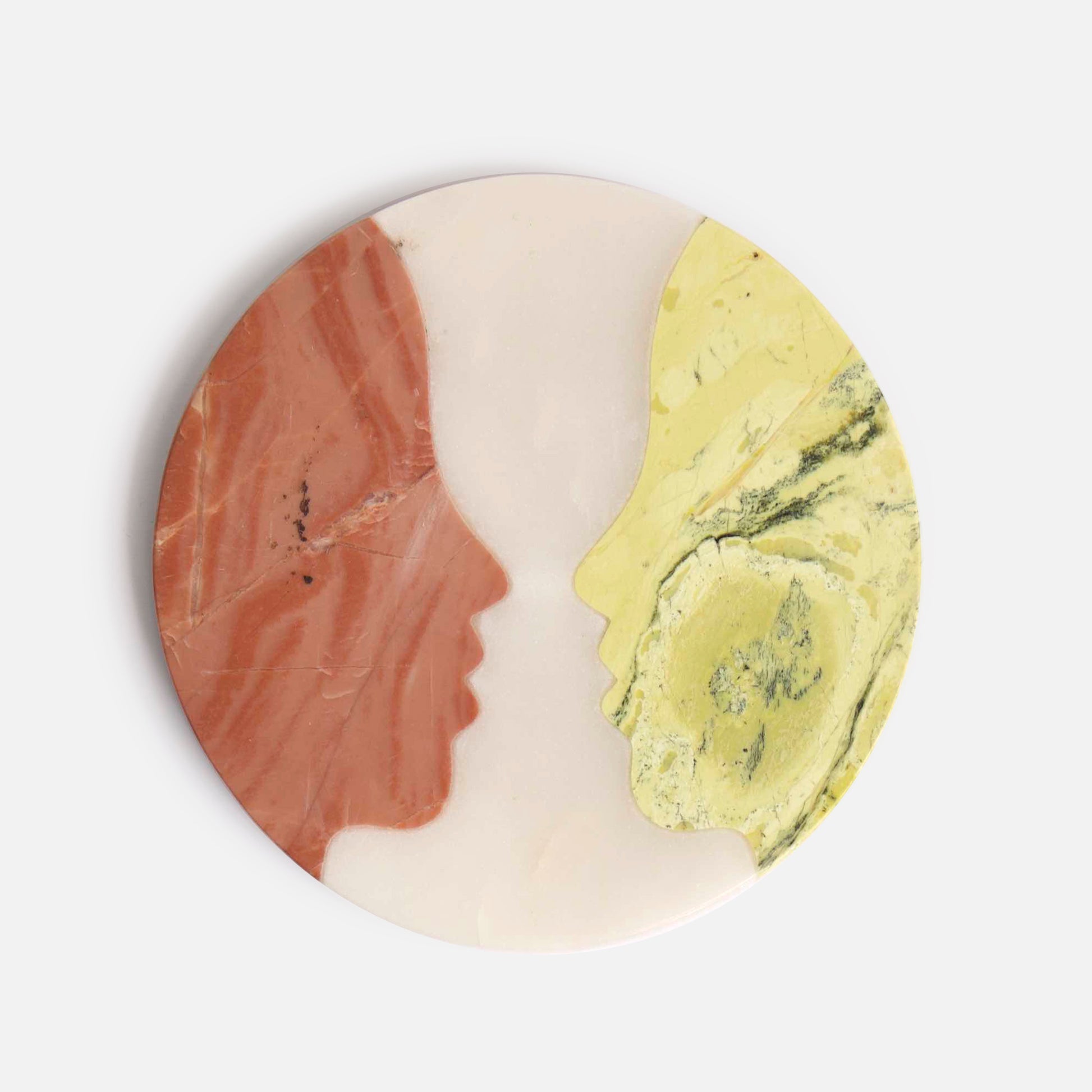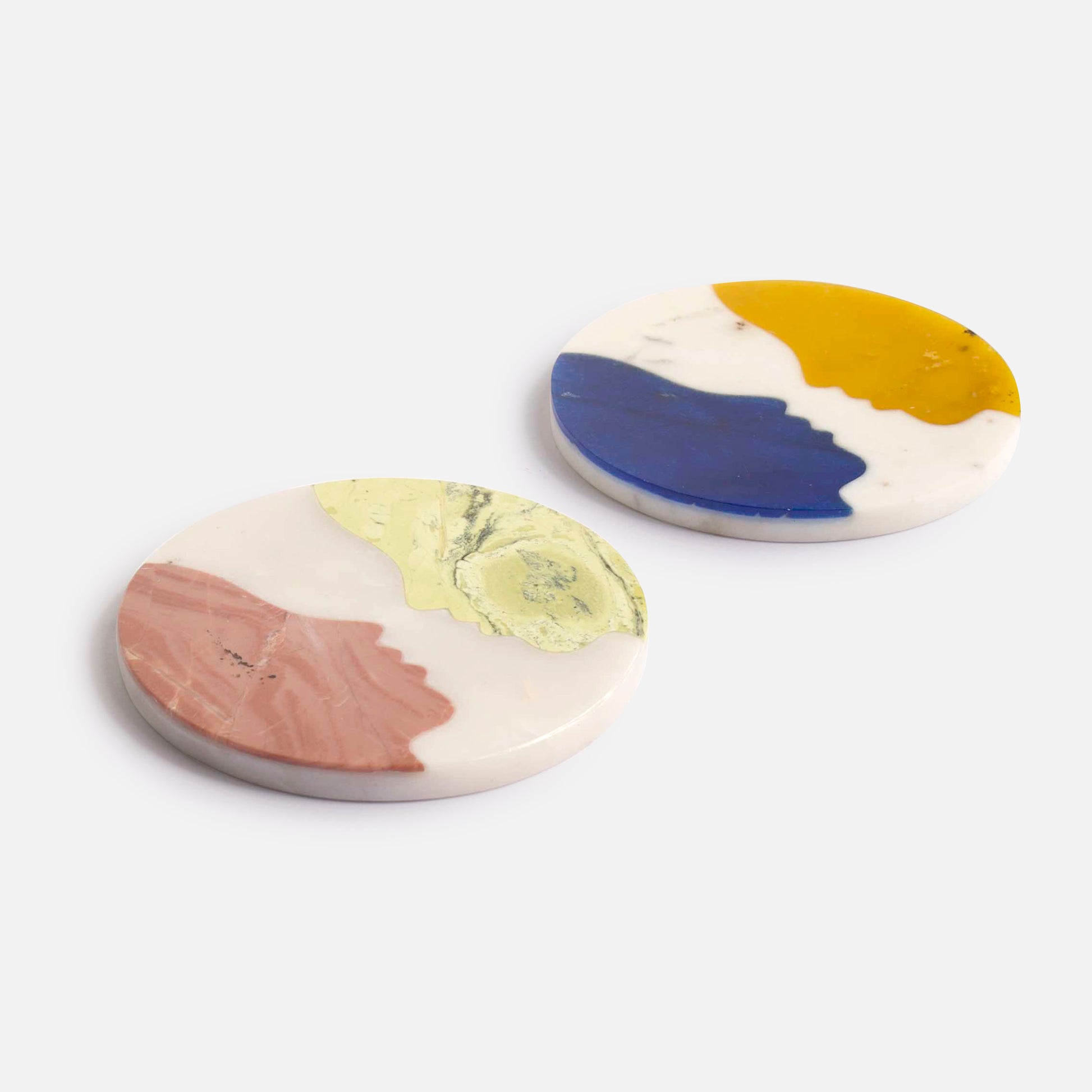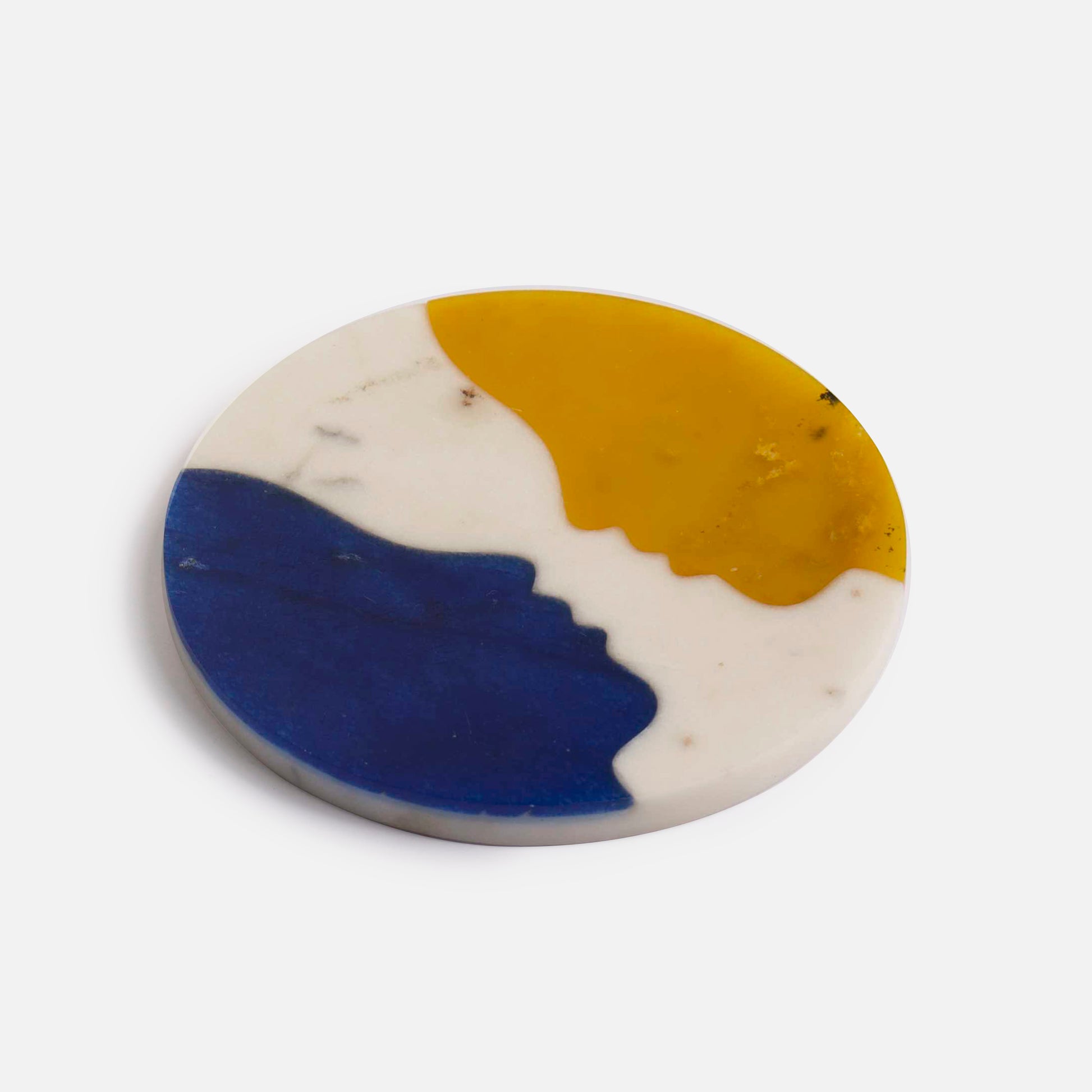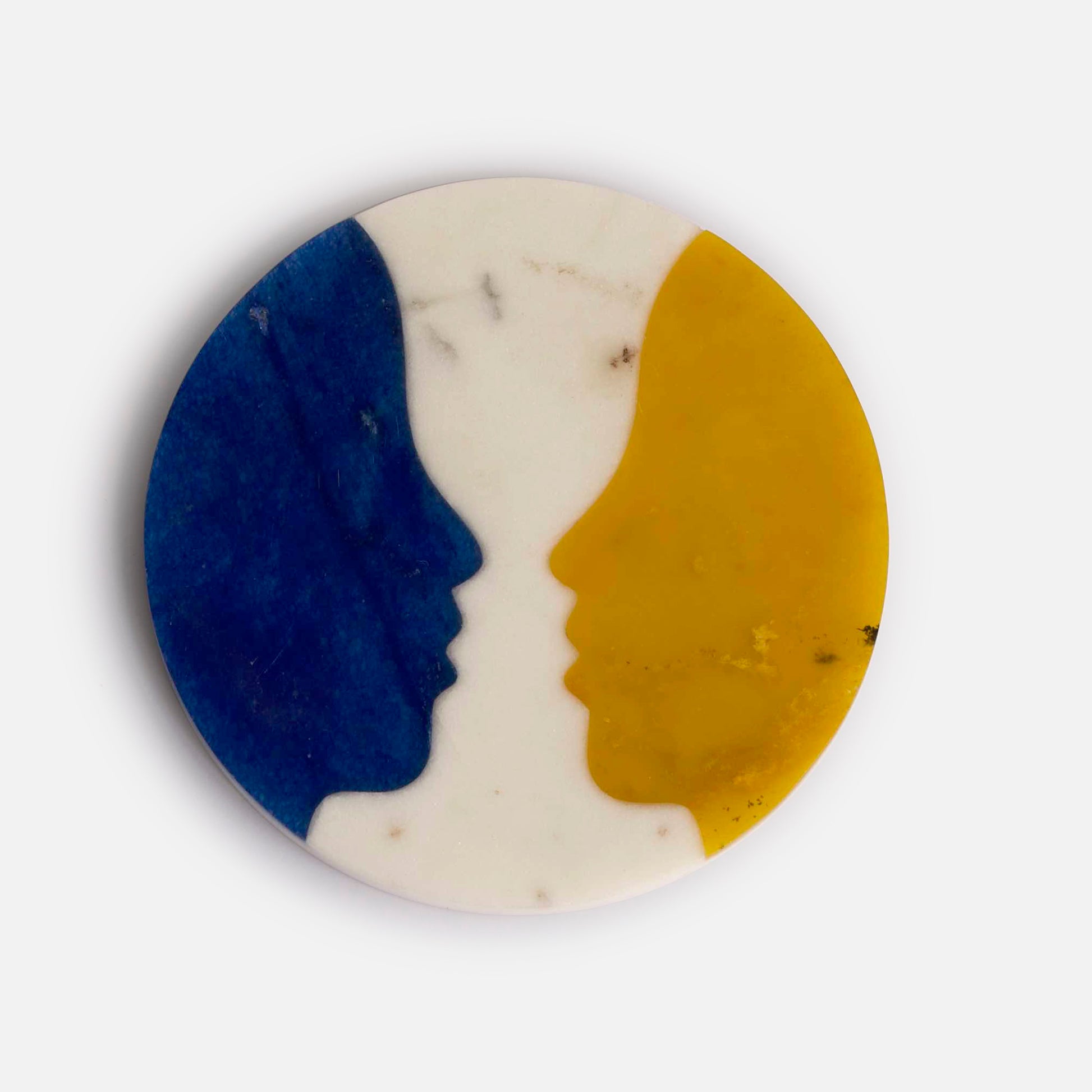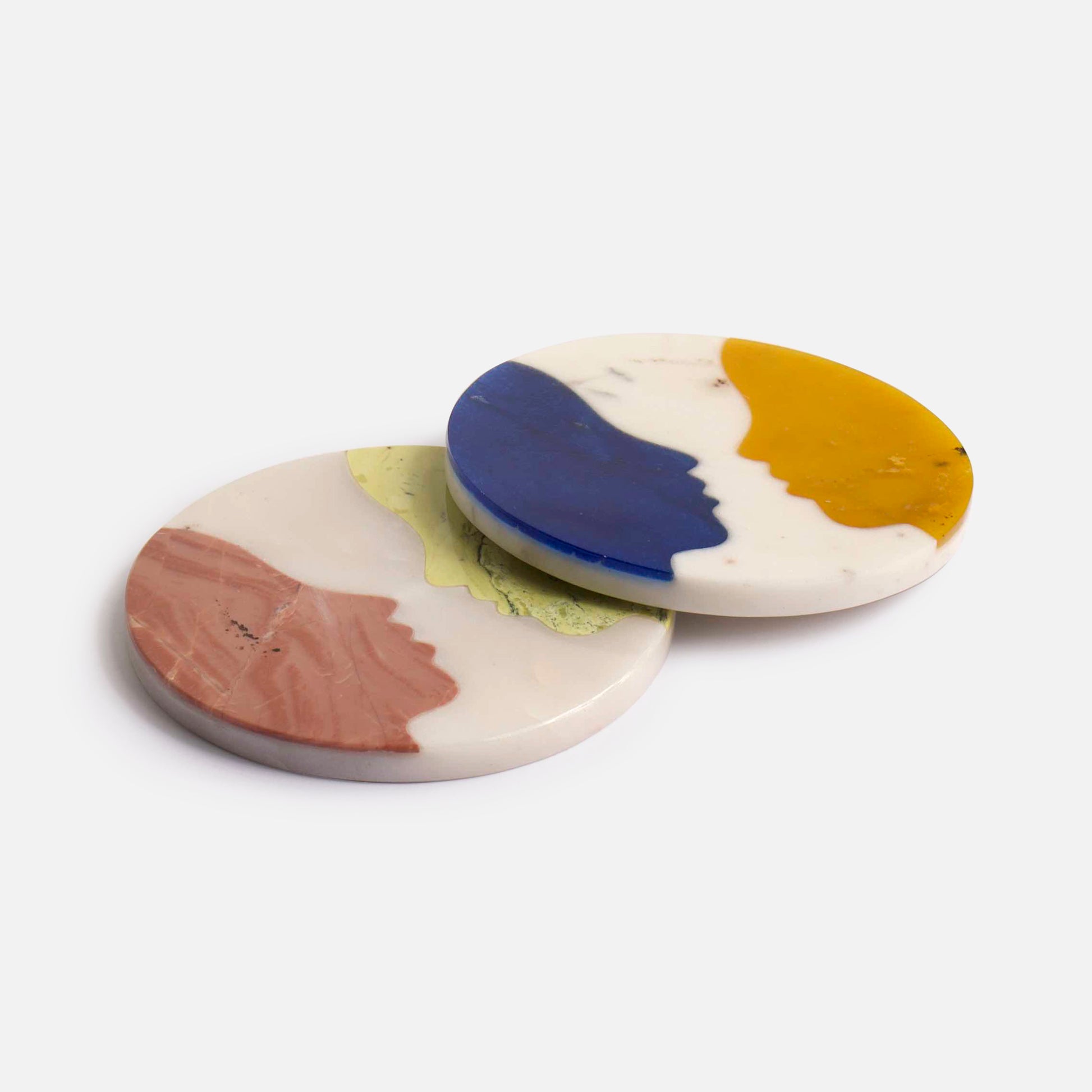 Elevate your tabletop with our Set of Two contrasting Marble Coasters, a fusion of artistry and functionality. Crafted from premium marble, each coaster features an intricately designed face motif, blending elegance with a touch of modern pop art. These coasters are lacquered, ensuring the marble remains pristine and resistant to stains, while providing a sleek, polished finish.