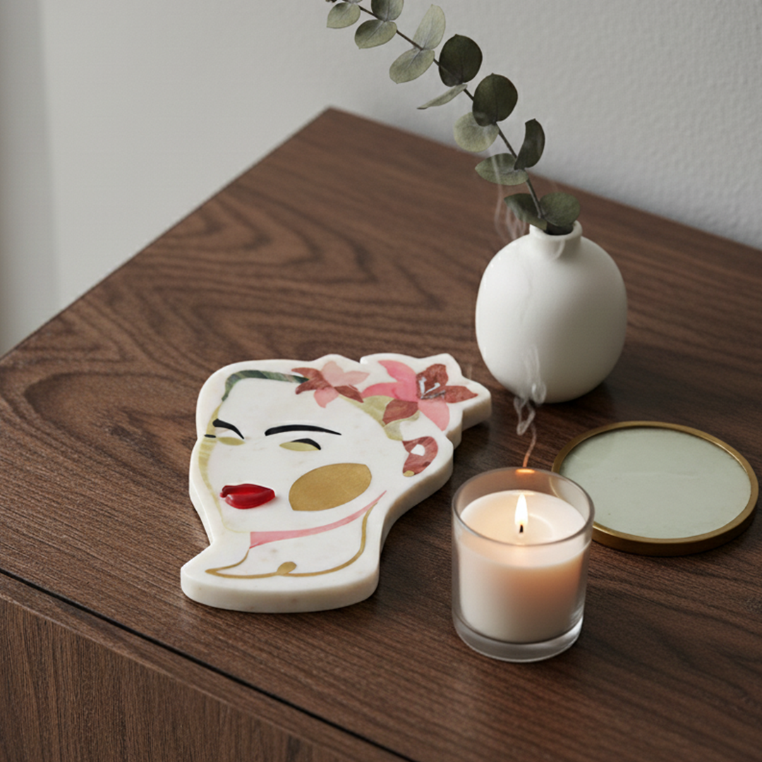 Make a bold statement with this handcrafted marble platter featuring a vibrant, artistic face design. Perfect as serveware or a decorative piece, it combines luxury with playful elegance. Ideal for modern homes and stylish gatherings.