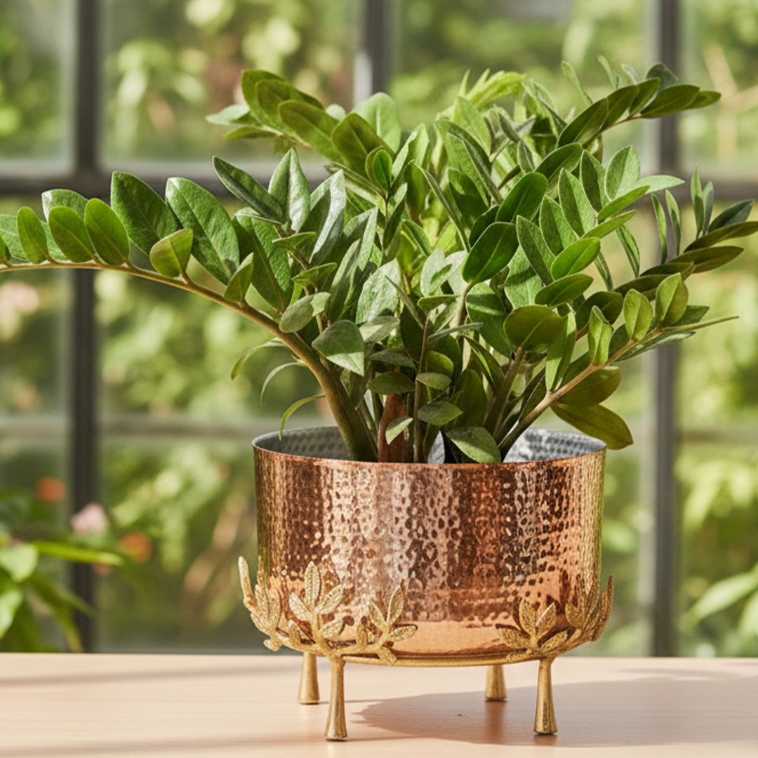 Inspired by the timeless dialogue between craft and nature, the Luxe Planter celebrates elegance through its hammered silver-toned body, adorned with golden foliage accents at the base. The hand-hammered texture reflects artisanal detailing, while the delicate gold leaves add a touch of sculptural luxury—making it as much a statement of art as it is a planter.