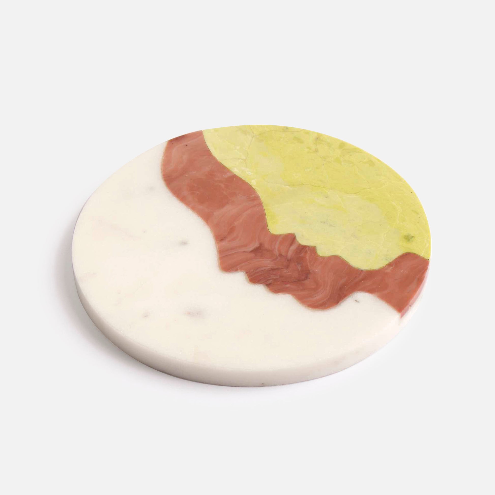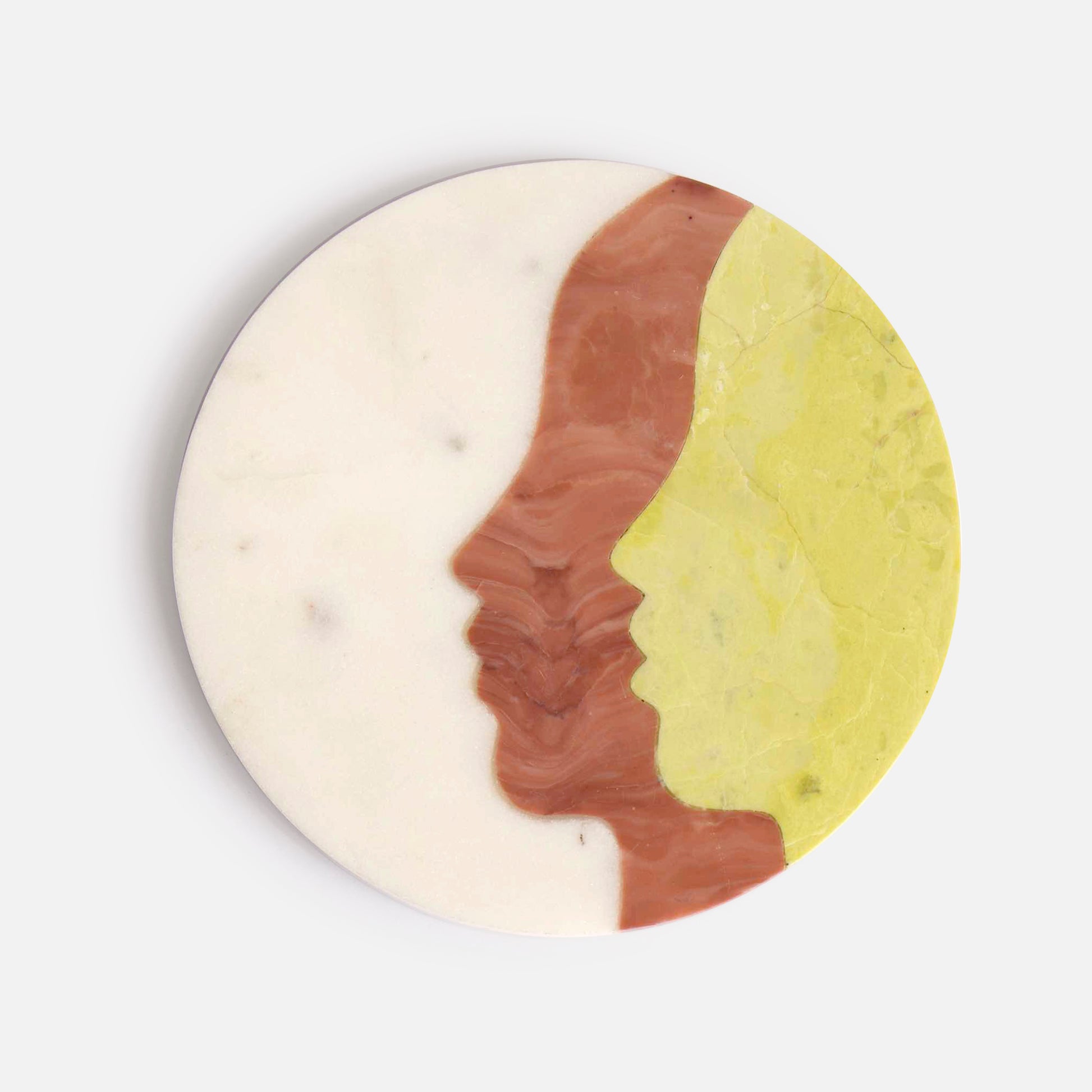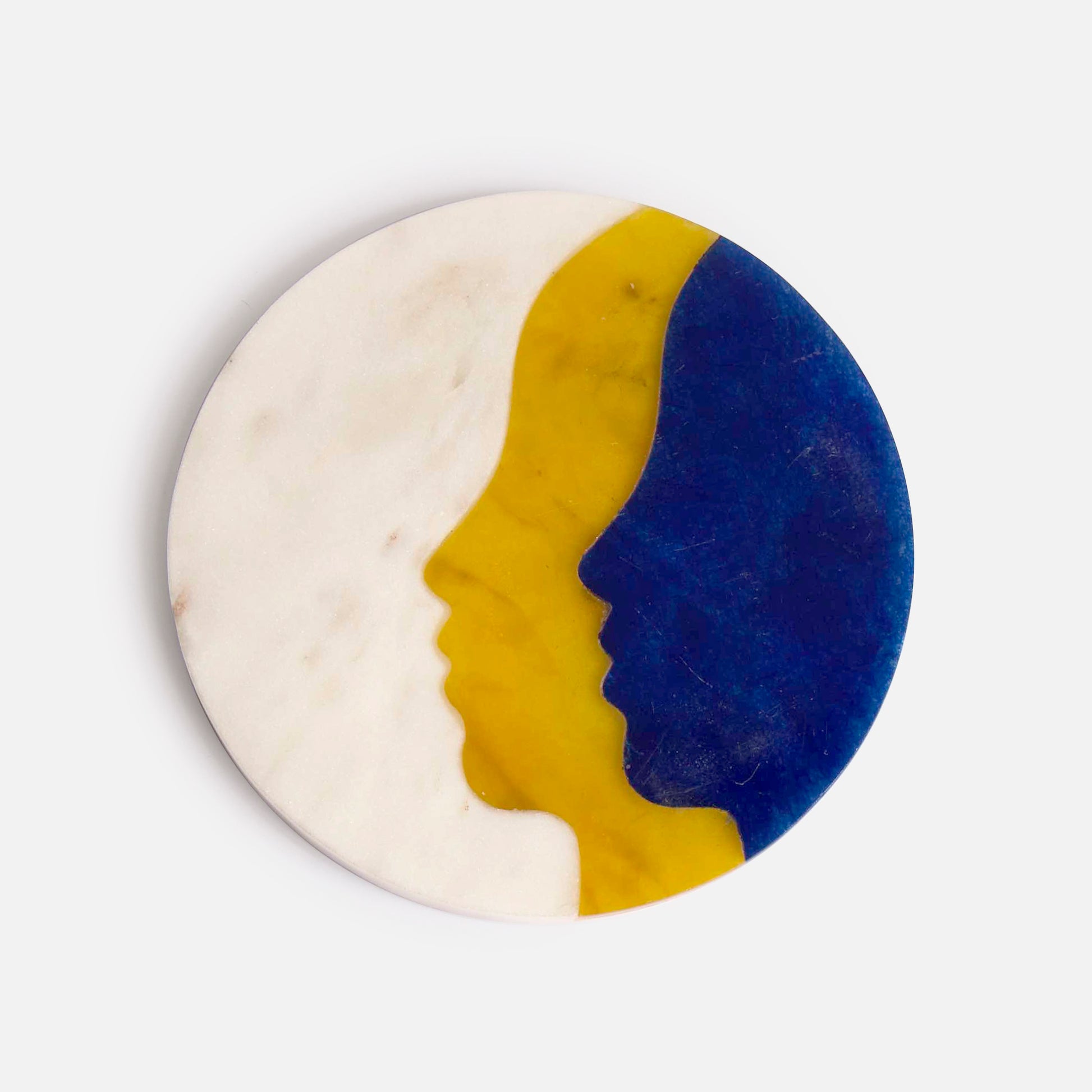 Elevate your tabletop with our Set of Two contrasting Marble Coasters, a fusion of artistry and functionality. Crafted from premium marble, each coaster features an intricately designed face motif, blending elegance with a touch of modern pop art. These coasters are lacquered, ensuring the marble remains pristine and resistant to stains, while providing a sleek, polished finish.