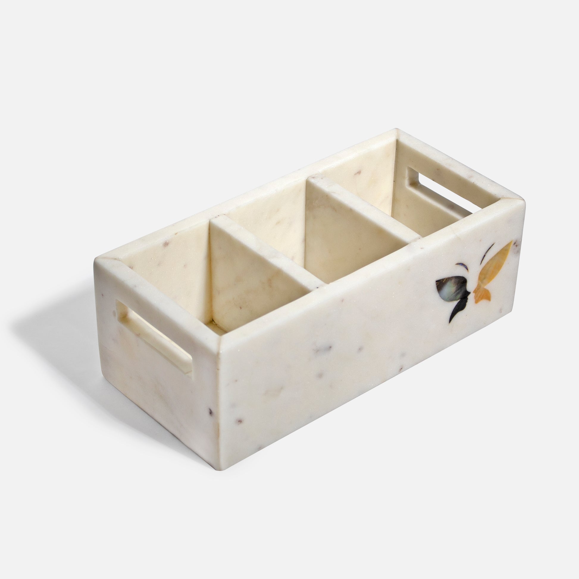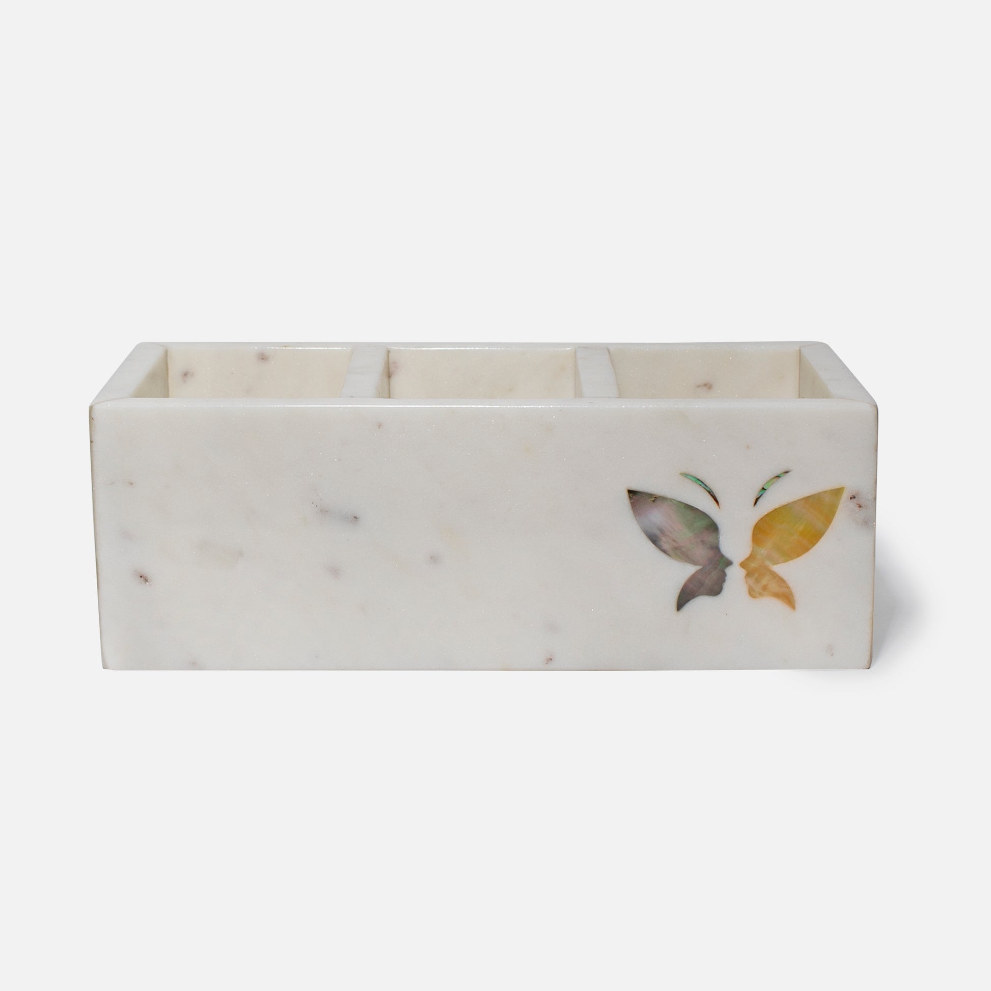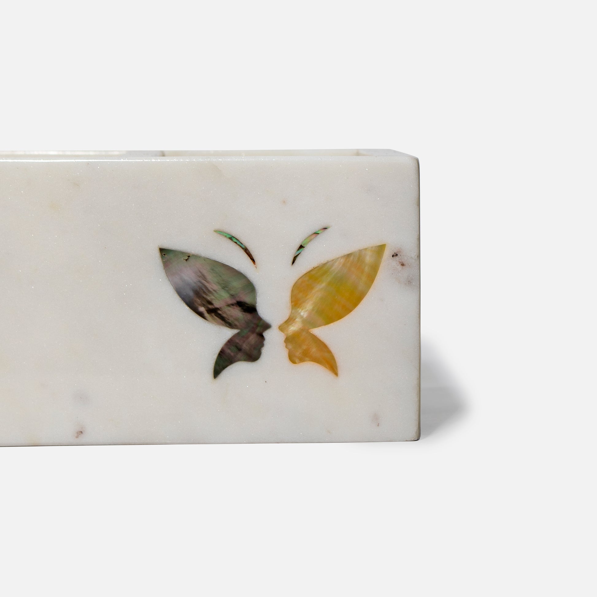 The delicate butterfly design, inlaid with shimmering silver and gold MOP, adds a touch of opulence and artistry, making it a true statement piece. Perfect for serving drinks, displaying decor, or as a captivating centerpiece, this tray seamlessly combines elegance and functionality. The intricate details and natural beauty of the materials ensure that each tray is a unique masterpiece, enhancing any space with its refined charm.