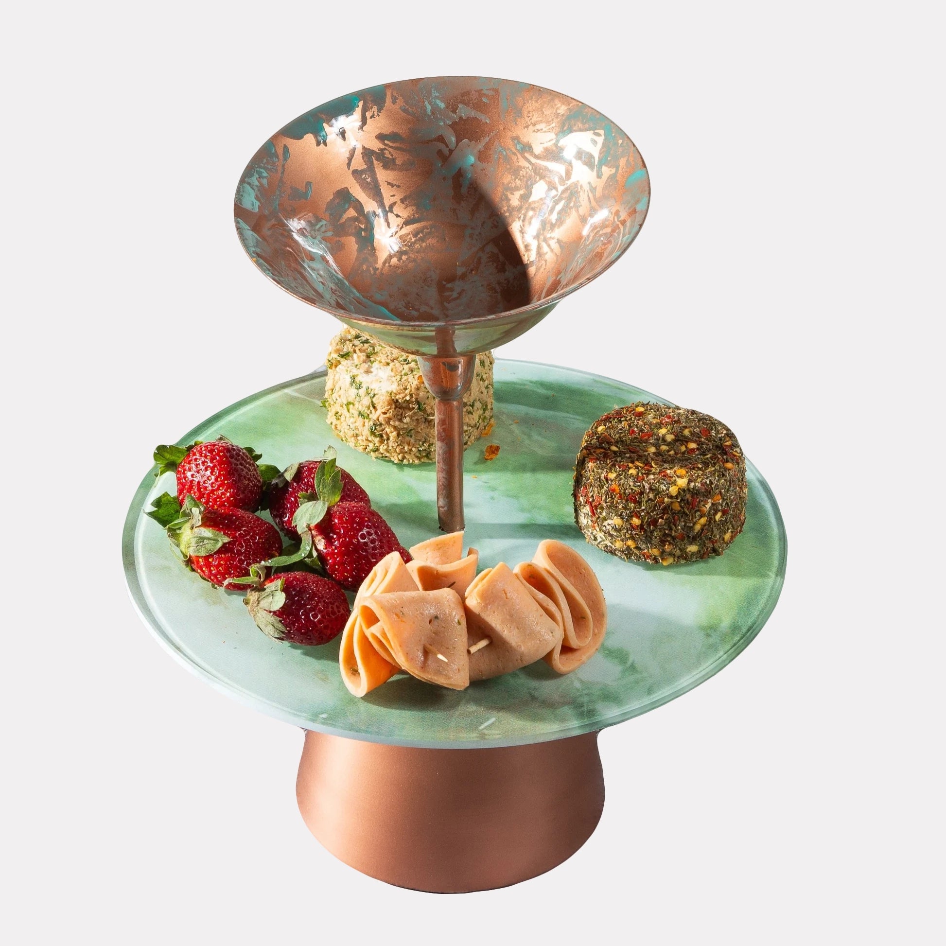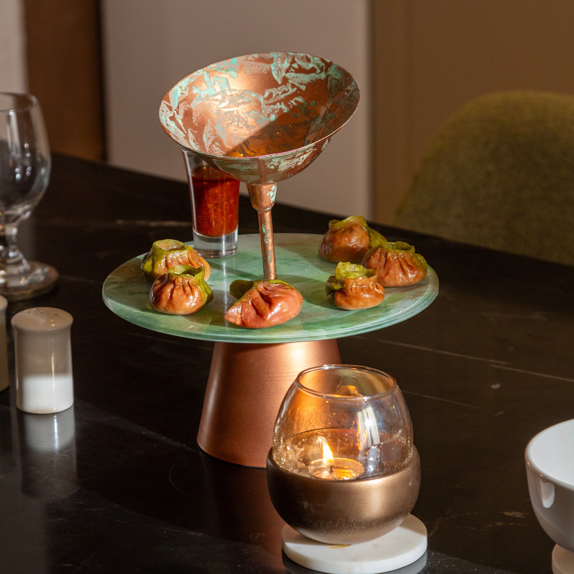 Inspired by the delicacy of the Tulip, the Polychrome Platter is a multi-use platter. Ideal to keep on your Centre tables and Dining Tables, This platter is a combination of refined materials. Made in two layers with a round glass plate a transparent blue hue, shop this platter is for exquisite object art.