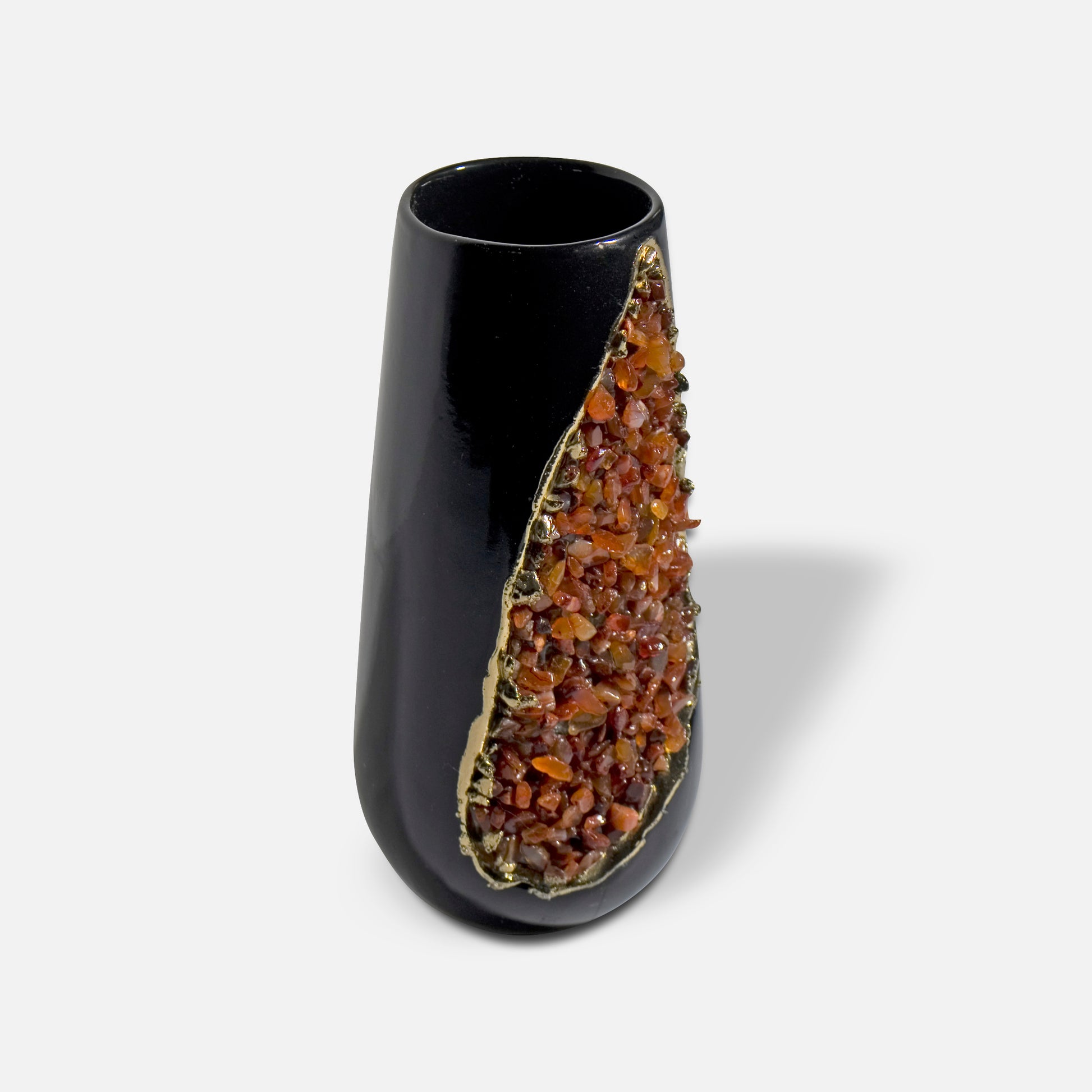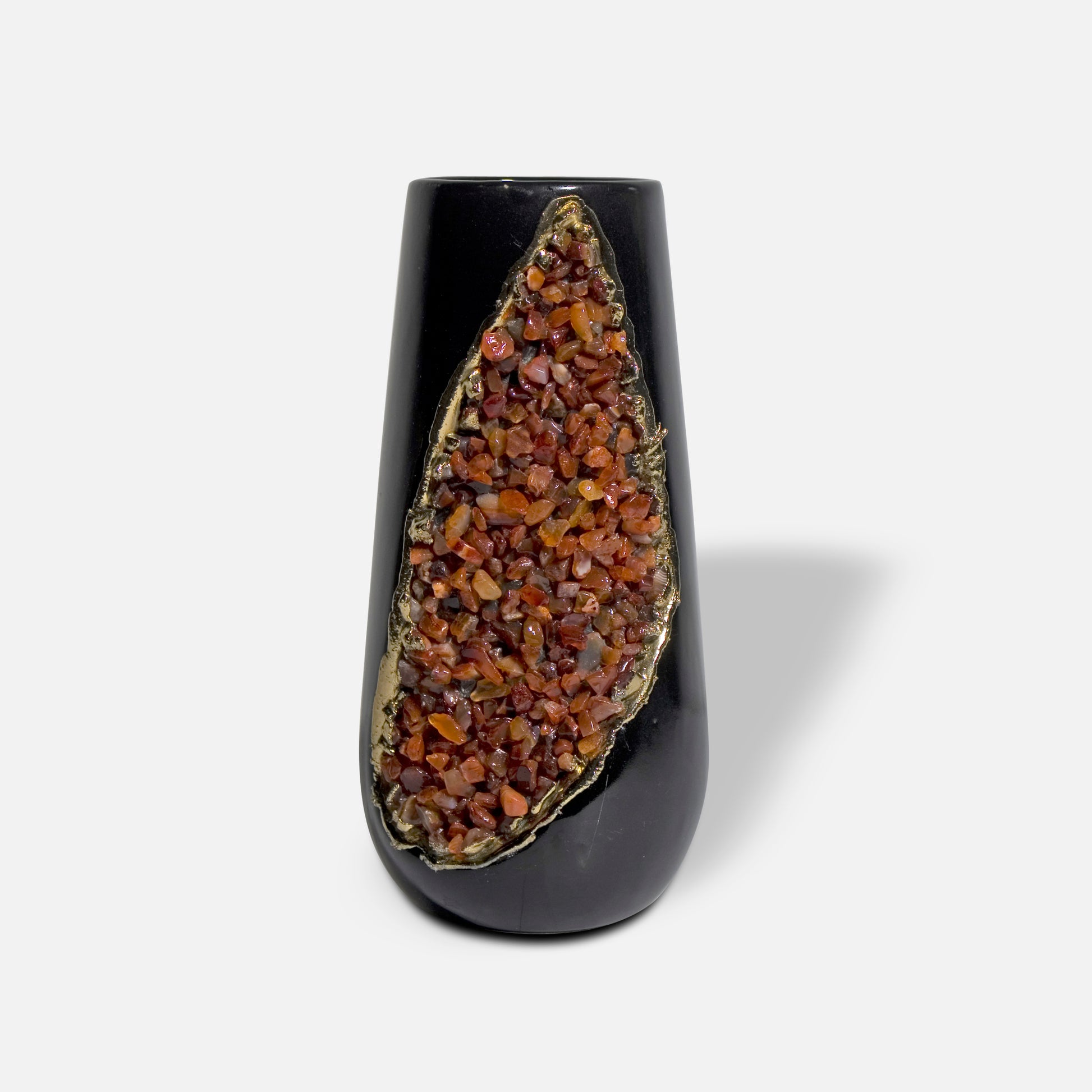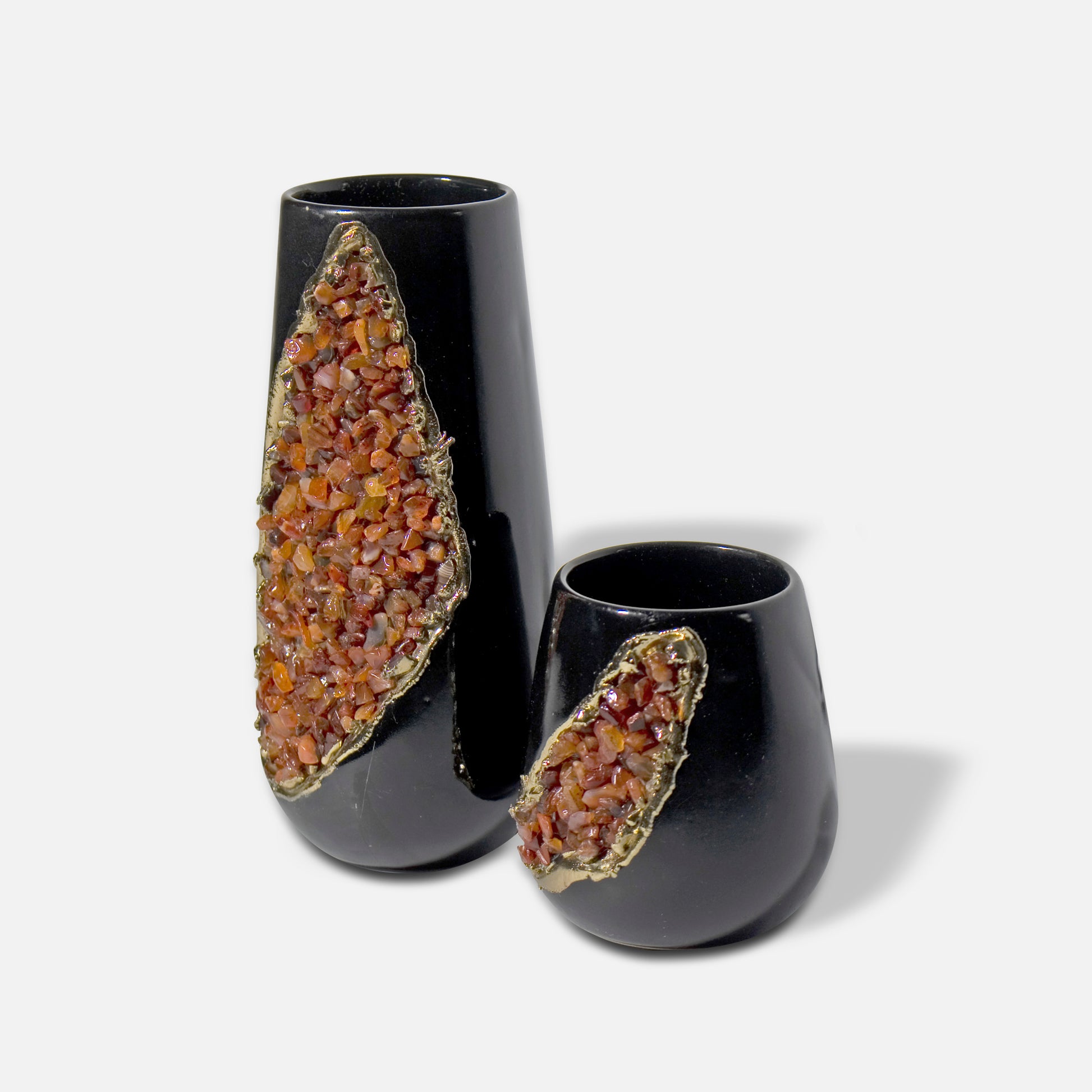 Transform your space with our Set of Two Black Vases, featuring striking orange semi-precious accents that create a stunning visual contrast. These vases are designed to make a bold statement, combining the deep, elegant richness of black glass with the vibrant, fiery hues of orange stone.