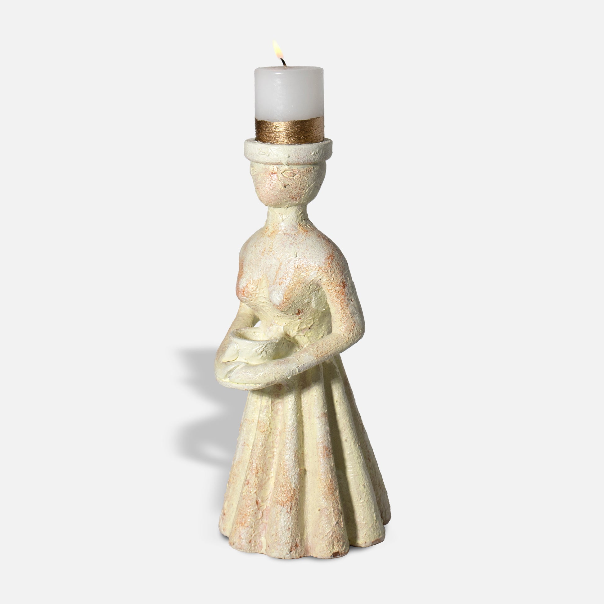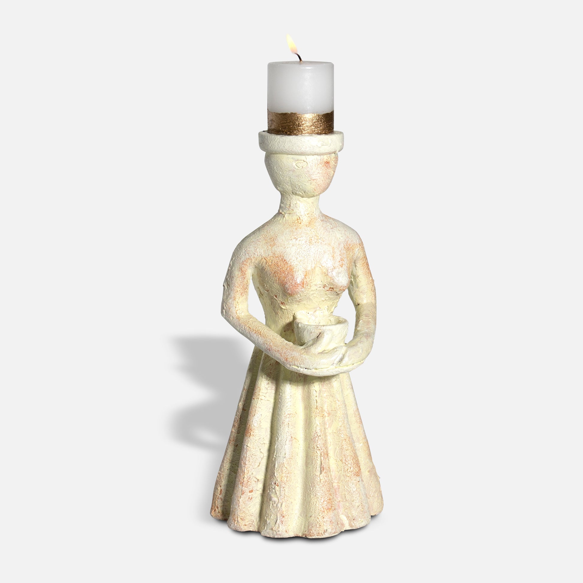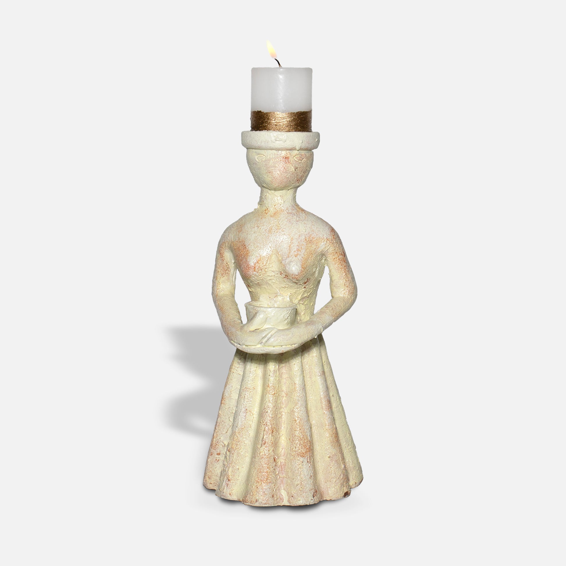 An unique piece is sculpted from natural terracotta, featuring a beautifully rough finish that celebrates the earthy texture and organic imperfections of the material. Designed with a subtle yet elegant silhouette, the figurine doubles as a tealight holder, offering a warm, ambient glow when lit. Perfect for adding a cozy atmosphere to any room.
