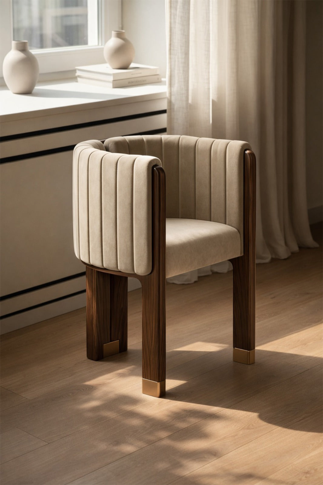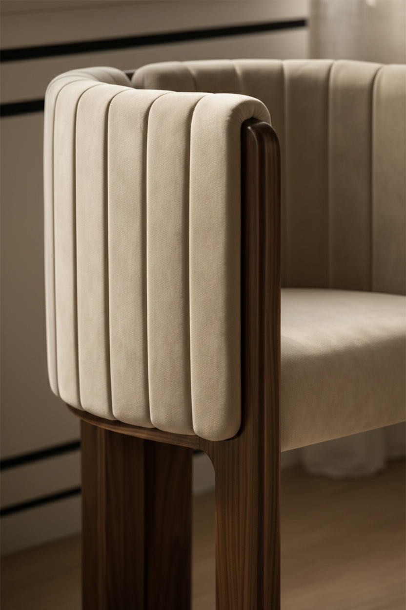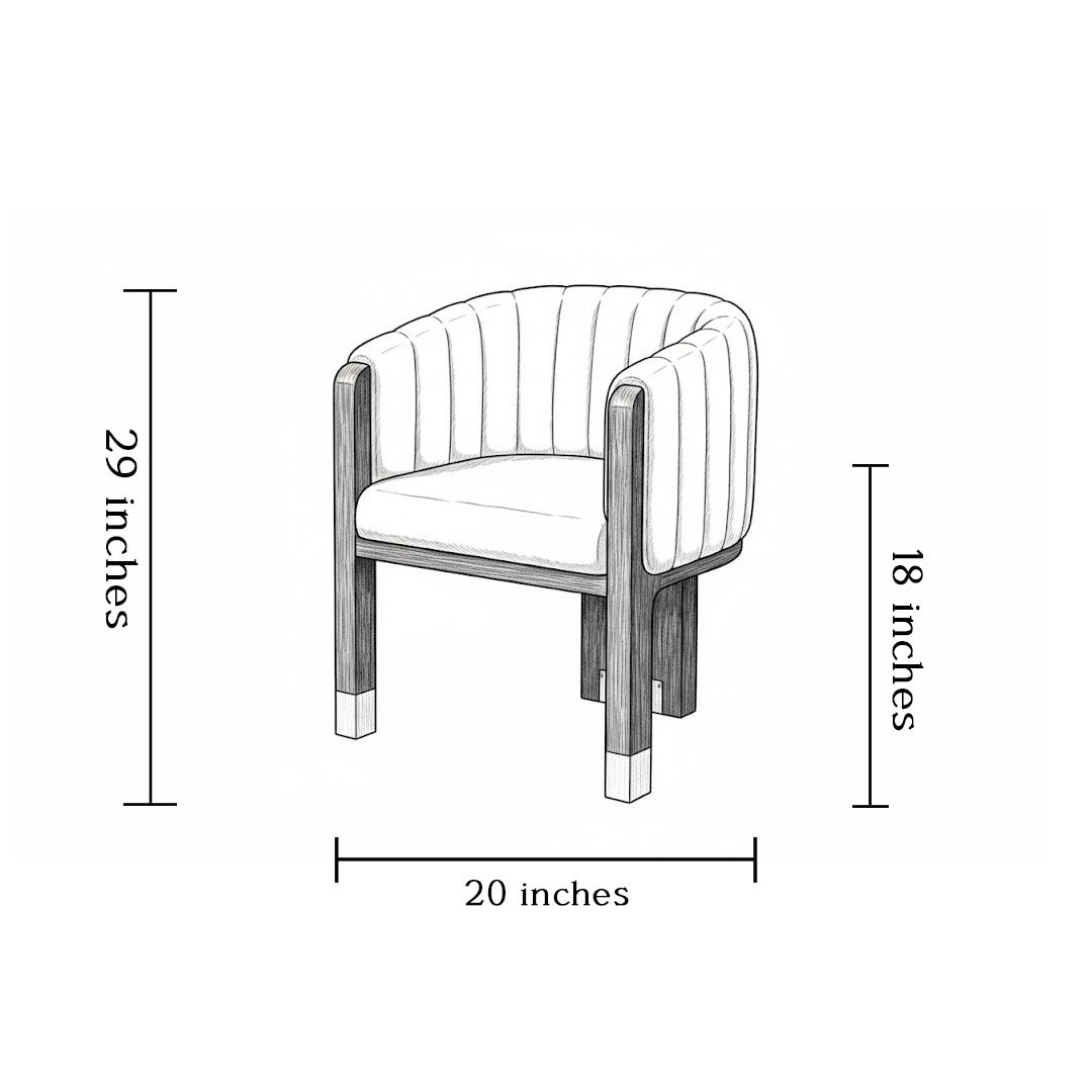 The Varenna Chair brings together sculptural warmth and tailored sophistication. Its gently curved, panel-stitched upholstery wraps around the seat in a soft, embracing form, while the solid wood legs introduce natural grain and architectural structure. Subtle metallic caps at the base add a touch of modern luxury, creating a chair that feels refined, grounded, and effortlessly elegant. Designed for contemporary living spaces, it stands as a versatile accent that balances comfort with timeless design.