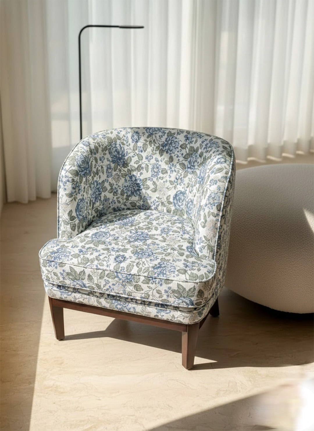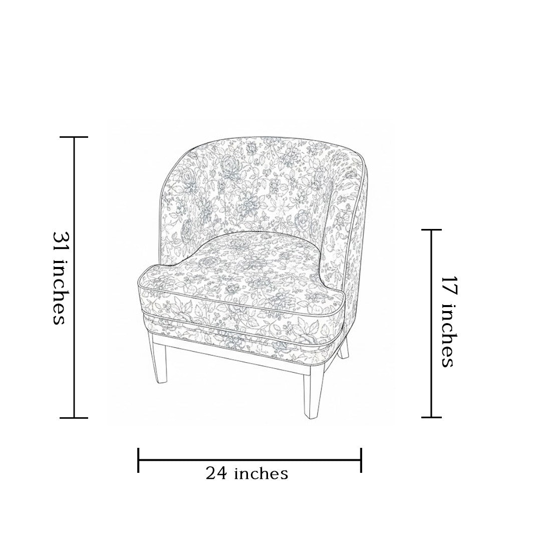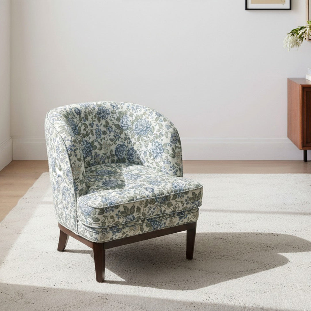 The Versailles Floral Chair blends classic romance with modern refinement, offering a soft rounded silhouette wrapped in delicate floral upholstery that instantly warms and uplifts any space. The subtle curves create an inviting, cocoon-like comfort, while the dark wooden legs add a refined contrast that grounds the design with quiet sophistication. Graceful, charming, and effortlessly versatile, it stands as a beautiful accent piece that brings both comfort and timeless elegance to living rooms, bedrooms, or intimate reading corners.