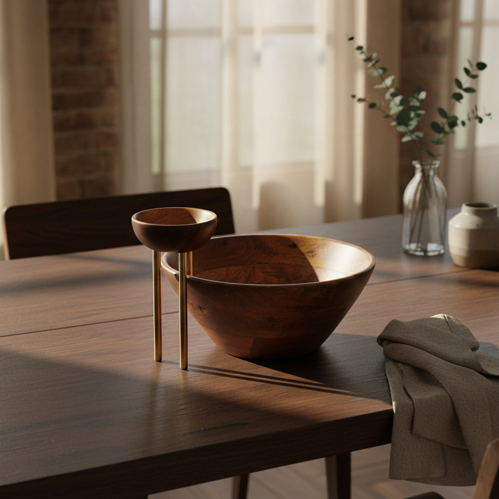 Elevate your home decor with this stunning set of wooden bowls, featuring a large and small bowl, both elegantly perched on a sleek metal stand. Crafted from premium wood, each bowl showcases the natural grain patterns, adding warmth and rustic charm to any space.